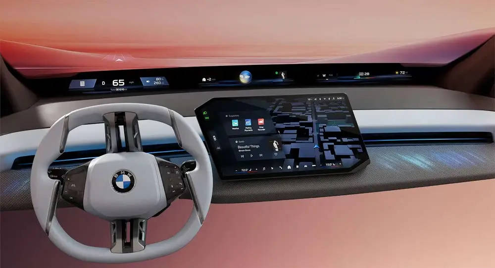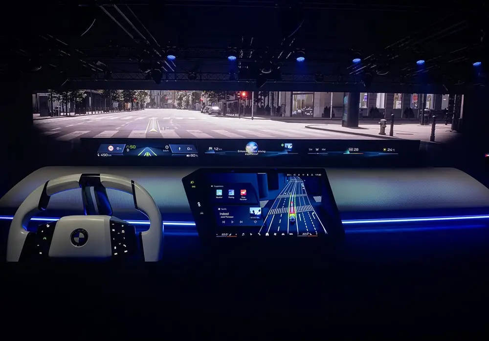 步入车内,iX3的内饰设计令人耳目一新,采用了行业首创的“视觉锥”布局。视平线全景显示系统利用超近距投影技术,在挡风玻璃上投射出近40英寸、4K分辨率的震撼画面,对比度高达100000:1。配合纳米涂层挡风玻璃,即便佩戴偏光墨镜,驾驶者也能清晰读取导航、车辆状态等信息。这一系统提供的成像距离在4至9米之间,与路面实景完美融合,带来无与伦比的真实景深感。